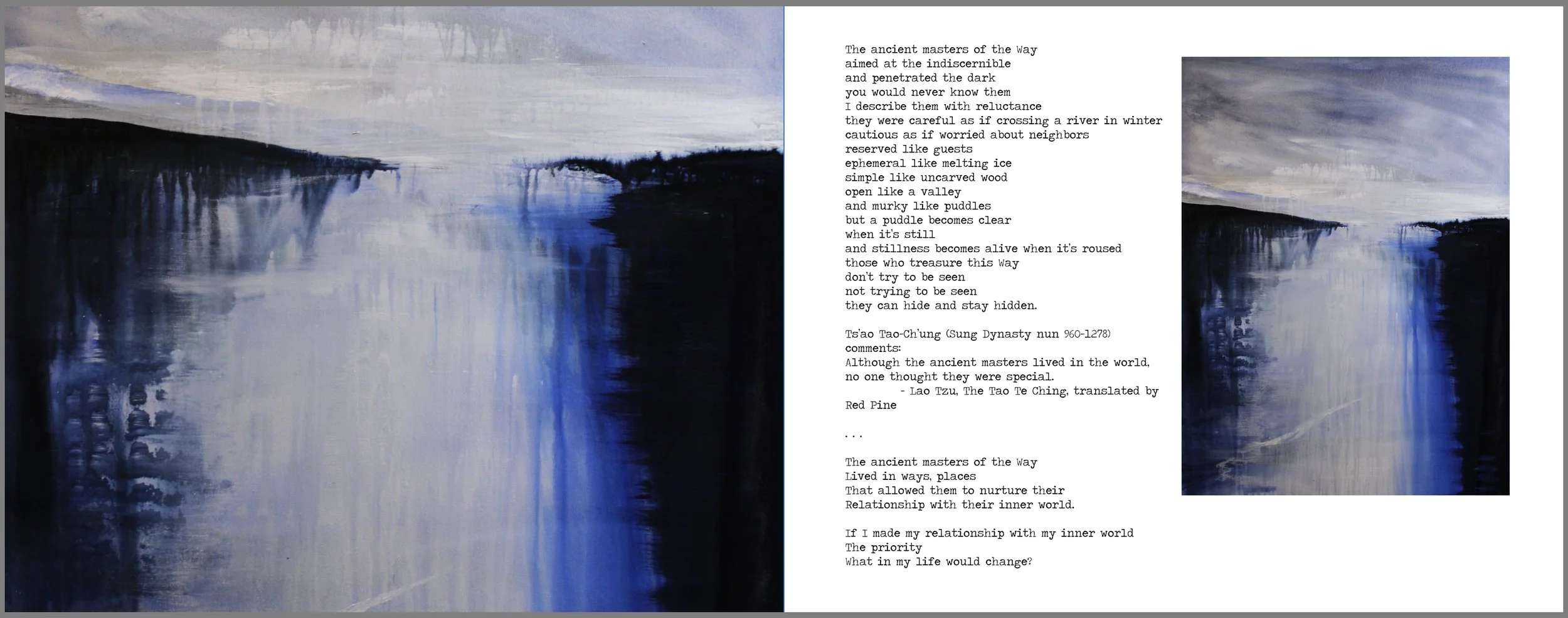 A mockup of the first two pages of the new book, Meditations on Gratitude, Beauty and Mystery. It is available now as a PDF, and in the next few days as a hardcover.