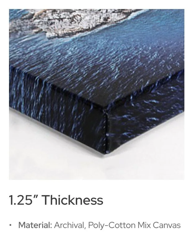 Matte stretched canvas on a 1.25" pine frame for a clean, gallery-like profile that stands out against the wall. These solid-wood stretcher bars ensure that the canvas print does not warp or bow over time. The rounded edges and beveled sides allow minimal contact with the canvas.