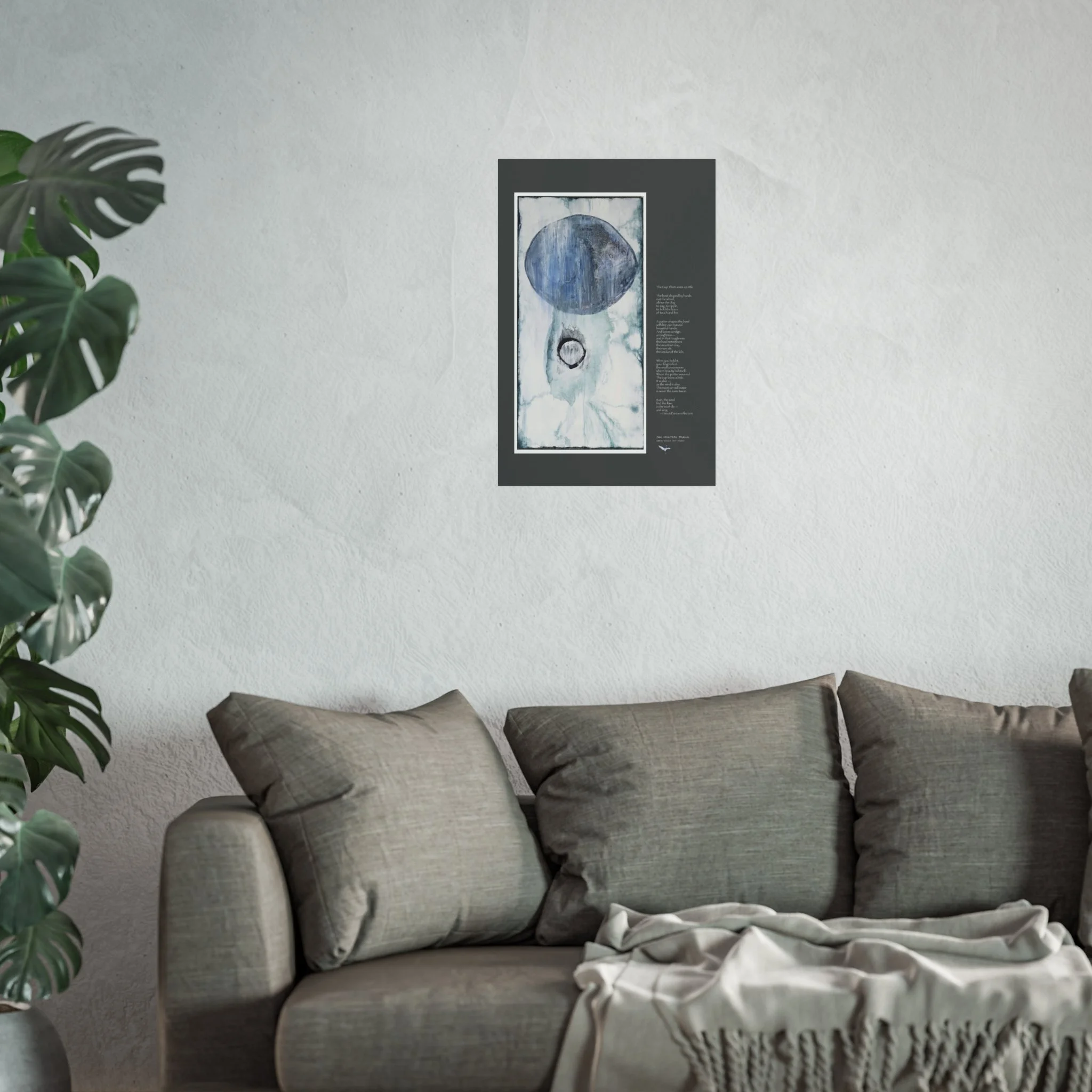 This gallery-style fine art poster brings a quiet, contemplative mood to any wall. Soft washes of indigo and slate form a large, moonlike orb above a whisper of texture, evoking late-night tides and inked memory. The muted palette and matte surface let light fall gently across the image, so it reads like a page from a travel journal or a personal map rather than loud decor. Hung in a reading nook, study, or minimalist living room, the print settles the space and invites slow looking—a subtle focal point that complements plants, plaster walls, and layered frames.